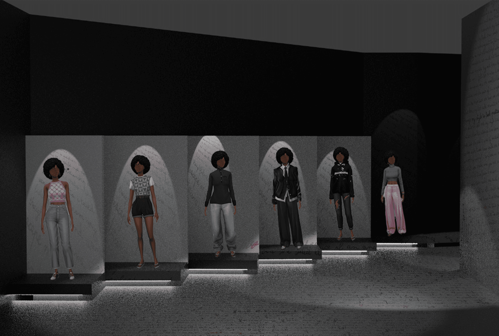 The Fix Store Exhibition: Mannequins dressed in clothing symbolizing phases of IPV, spotlight storytelling, immersive journey.