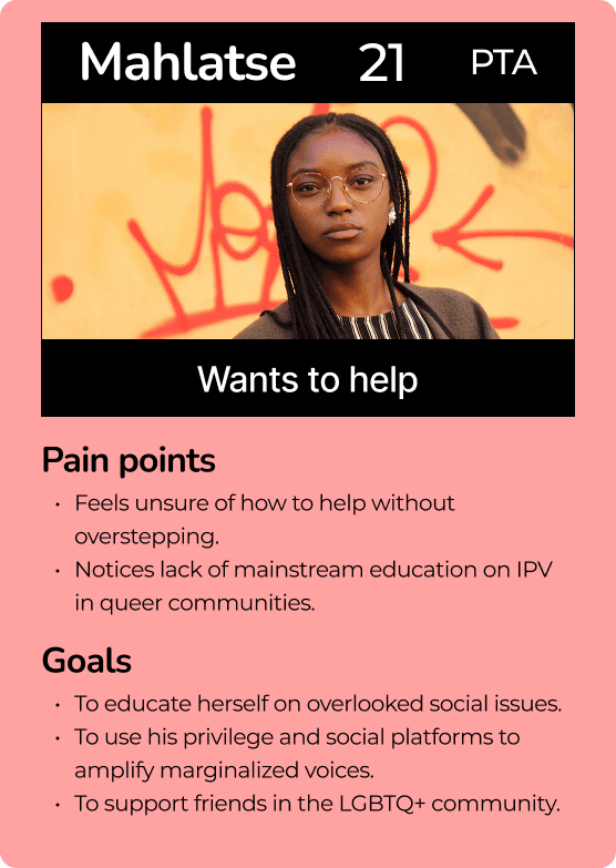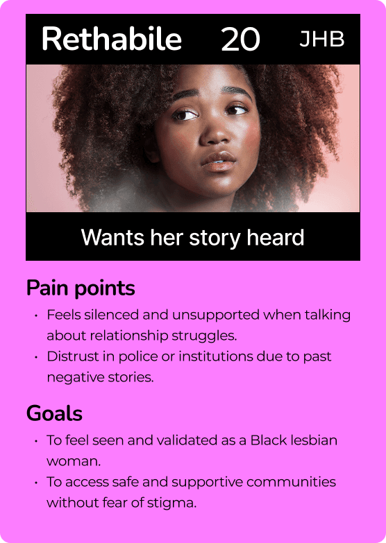 Reabetswe represents the many Black lesbian women whose experiences with intimate partner violence remain hidden behind stigma, silence, and disbelief.
